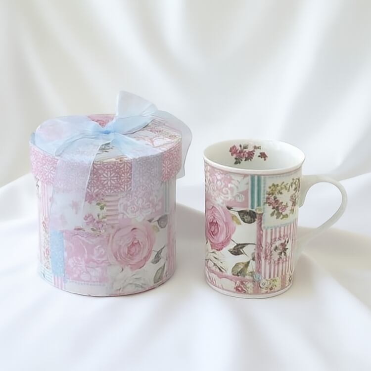 ローズ柄の化粧箱の中に同柄のマグカップが入っています。