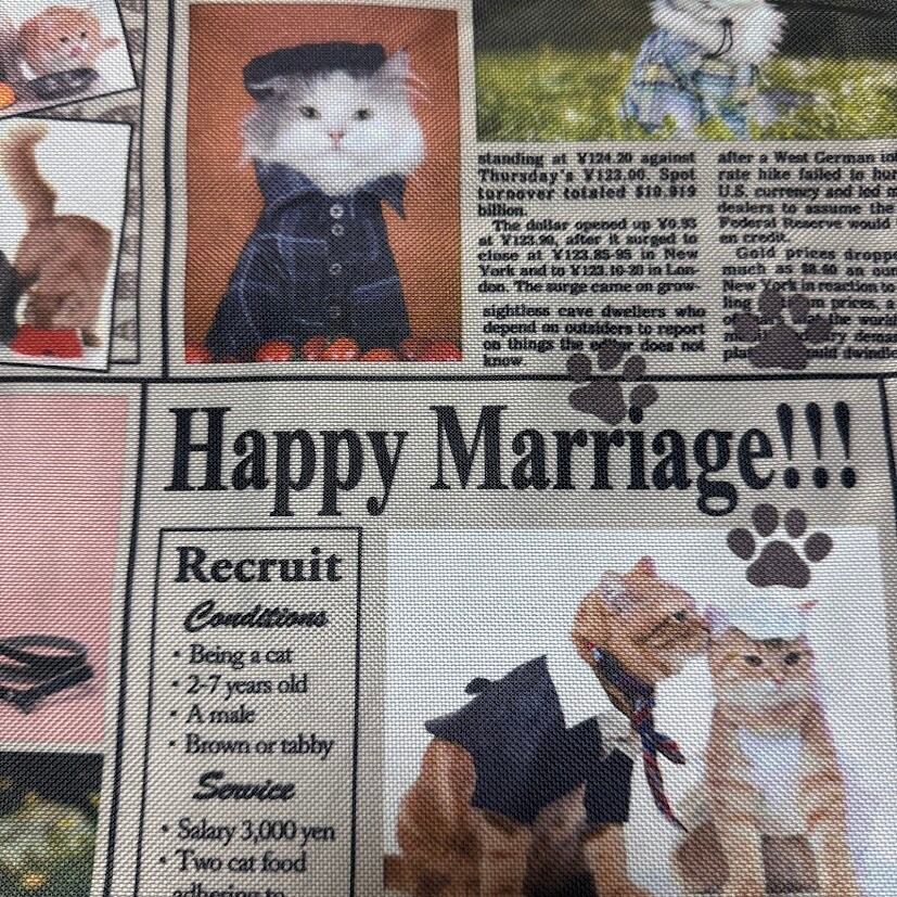 猫ちゃんの写真と新聞記事が素敵にコラボした手提げバッグです。