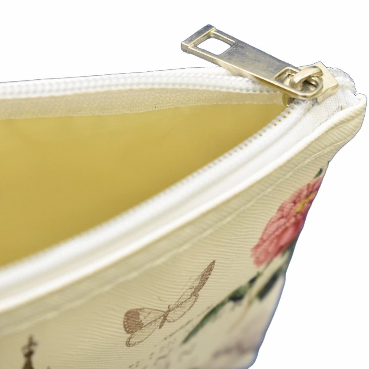 ヨーロッパ調の白地に花や有名な建物がデザインされた丸形とスクエア型のポーチのセット。
