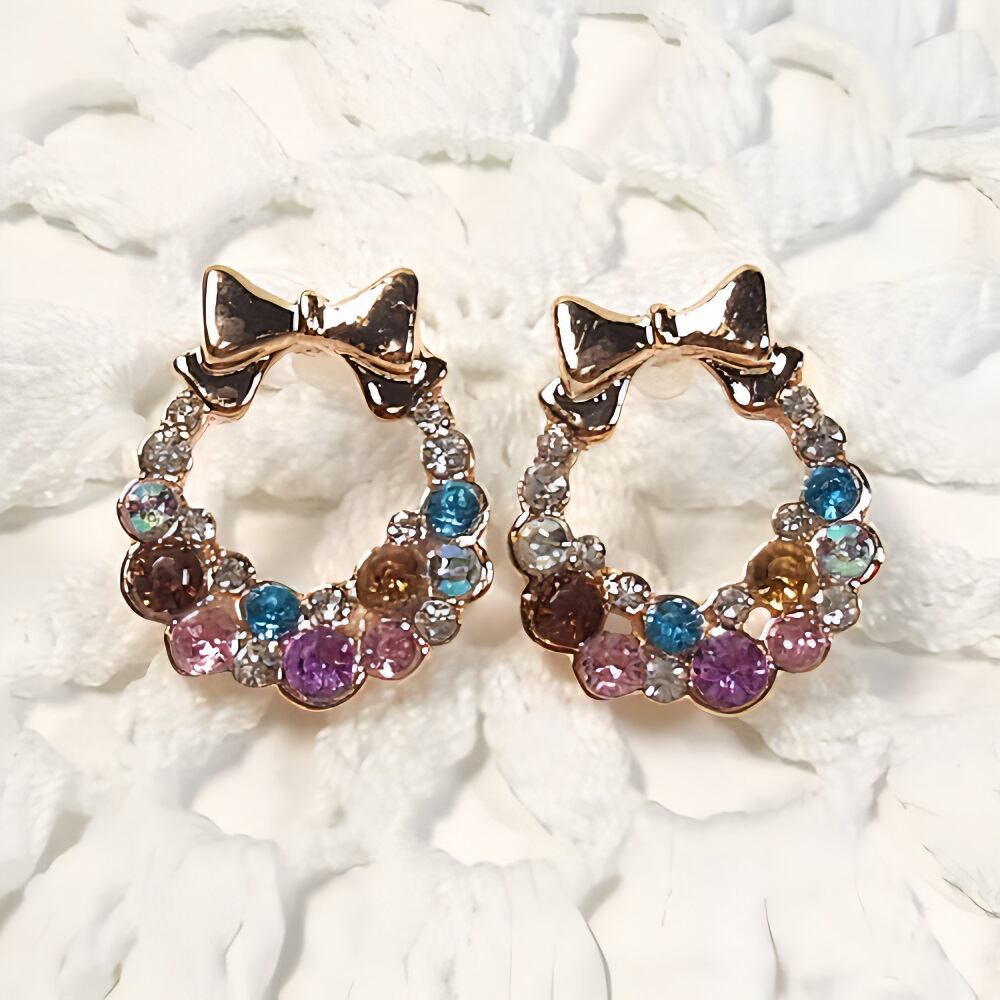カラフルなストーンがかわいいリボンモチーフピアスです。
