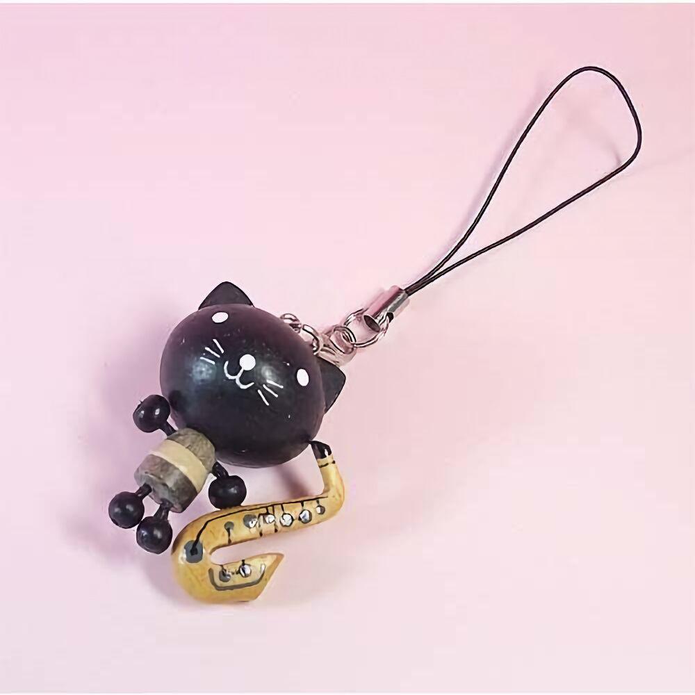 猫と楽器のストラップ 黒猫&サックス ネコ キャット