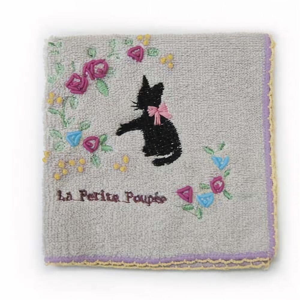 手刺しゅうタオル バラと子猫 グレー ハンカチ ハンドタオル ネコ キャット
