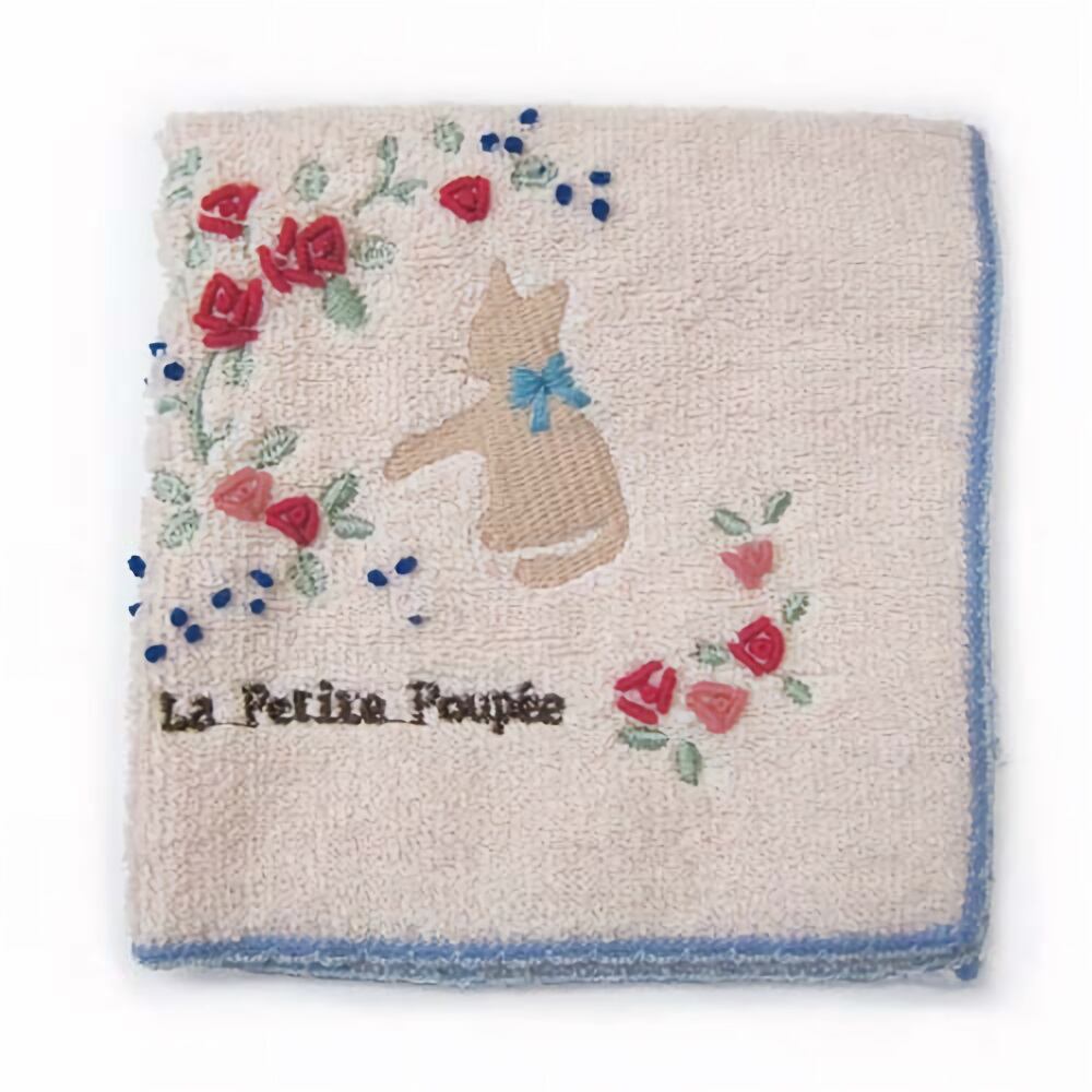 手刺しゅうタオル バラと子猫 ピンク ハンカチ ハンドタオル ネコ キャット