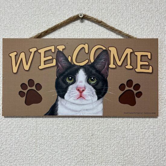 【クリアランス】難あり アメリカ直輸入 木製ウェルカムプレート ハチワレ 猫 キャット ネコ