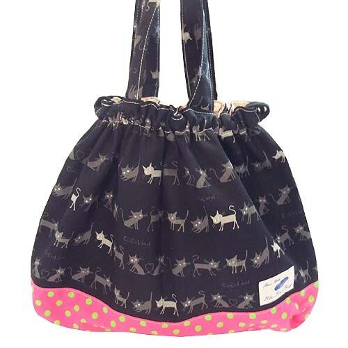 ハンドメイド 猫&水玉柄巾着バッグ C ネコ キャット ドット