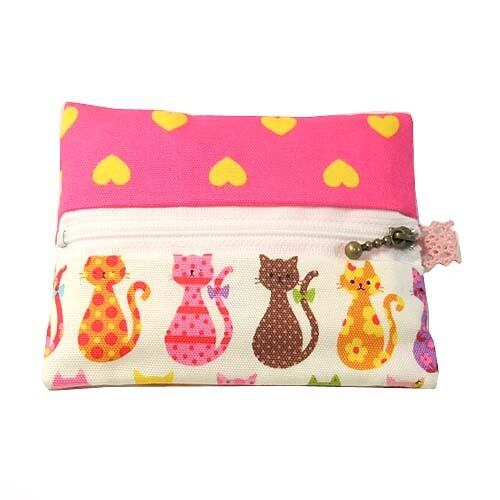 ハンドメイド ファスナー付猫&ハート柄ポケットティッシュカバー U ネコ キャット