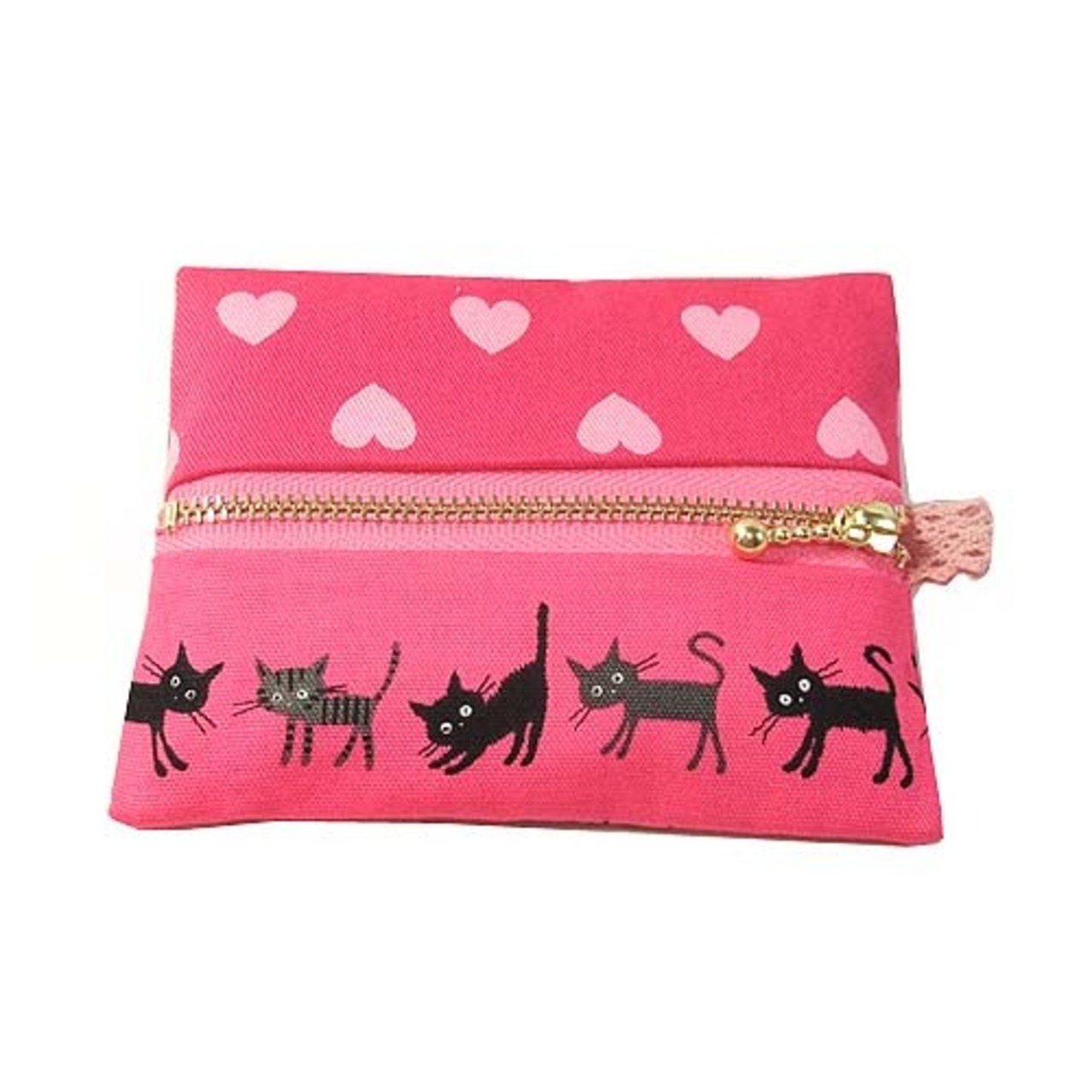 ハンドメイド ファスナー付猫&ハート柄ポケットティッシュカバー R ネコ キャット