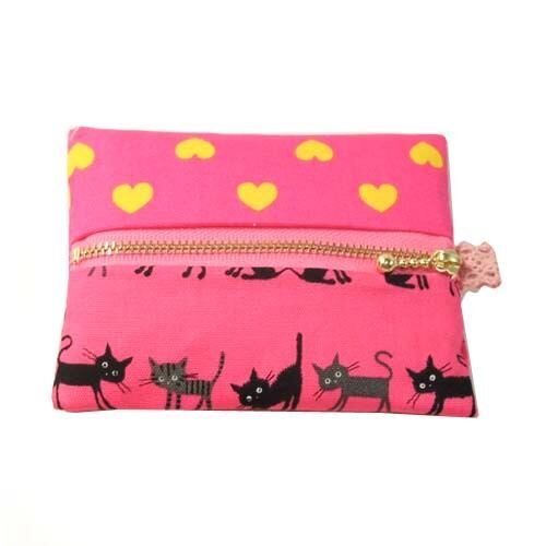 ハンドメイド ファスナー付猫&ハート柄ポケットティッシュカバー Q ネコ キャット
