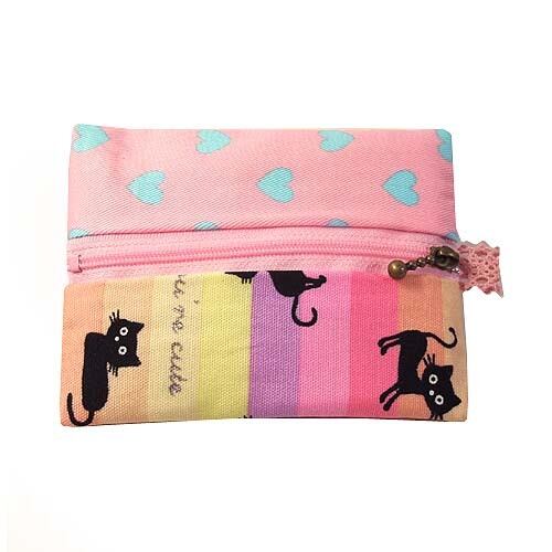 ハンドメイド ファスナー付猫&ハート柄ポケットティッシュカバー M ネコ キャット