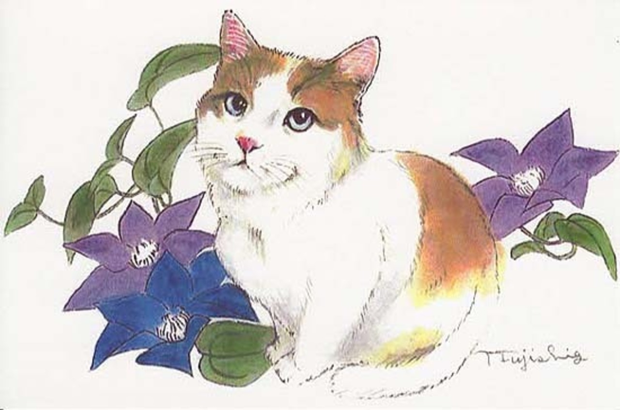 藤重日生 猫絵カード 「てっせんと猫3」 ポストカードサイズ fuji120028