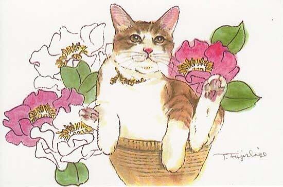 藤重日生 猫絵カード 「芍薬と猫」 ポストカードサイズ fuji120020